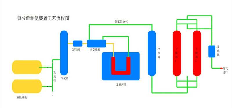氨分解制氫是以液氨為原料,在鎳催化劑的作用下,加熱800℃-850℃分解得到含氫75%,含氮25%的氫氮混合氣體。分解率可以達到99.9%。露點為-10℃。